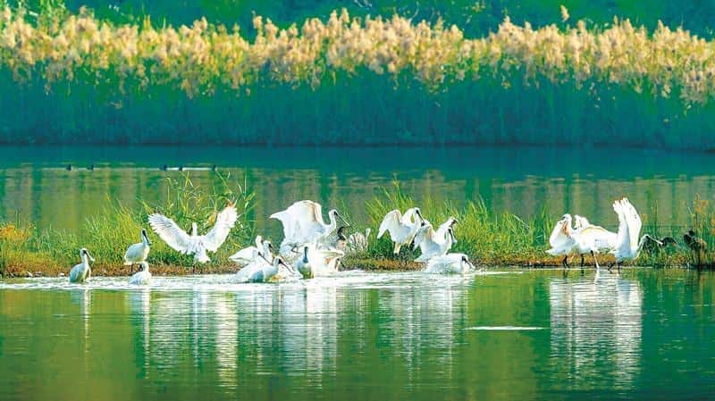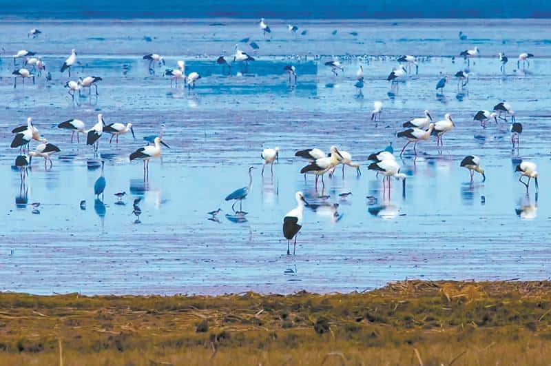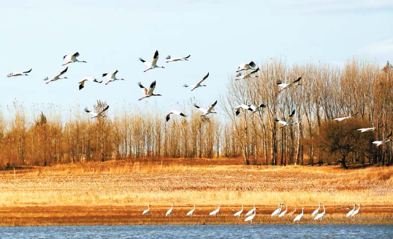 入秋以来,吉林向海国家级自然保护区格外热闹,白鹤、丹顶鹤、白头鹤、东方白鹳、青头潜鸭……数十万只水鸟在湿地里栖息觅食,带来了无限生机。