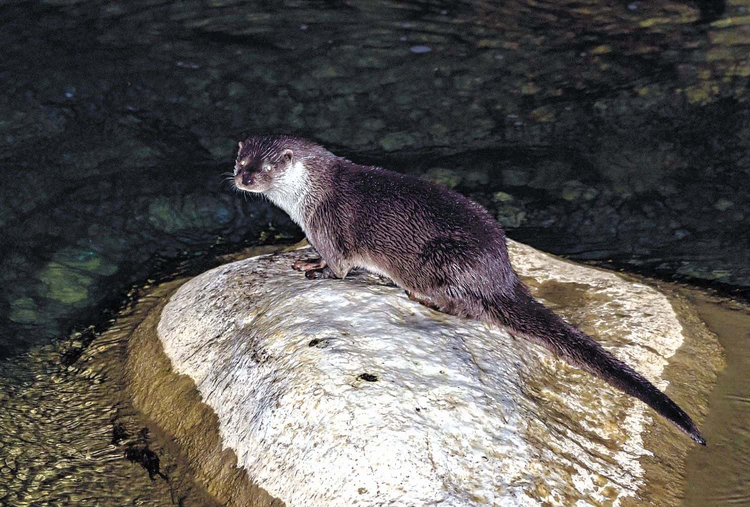 欧亚水獭又称“水狗”“鱼猫”,食肉目鼬科水獭属动物,被列为世界自然保护联盟濒危物种红色名录近危物种。这种曾经一度消失近30年的物种,于2014年在佛坪县城段河道首次被发现,目前它们已经在佛坪县有较为稳定的繁殖群。它们在水中游得十分丝滑,县城的市民们在晚间散步时只要看到翻板闸水面上荡起一道道涟漪,就知道有水獭正在活动。在霓虹灯的照映下,水獭们时而在岩石上蹭体,时而在河岸上下翻腾,时而在水中捕鱼。作为捕鱼能手的欧亚水獭食量很大,一只成年水獭体重大约5千克,每天要吃掉1—1.5千克的鱼。因此,只有鱼类资源丰富的溪流,才能保证水獭种群生存繁衍。有人观察发现,不足半小时,一只水獭就能捕鱼8条。水獭进食时,往往先从鱼头吃起,吃不完的或藏起来或丢弃在石头上。