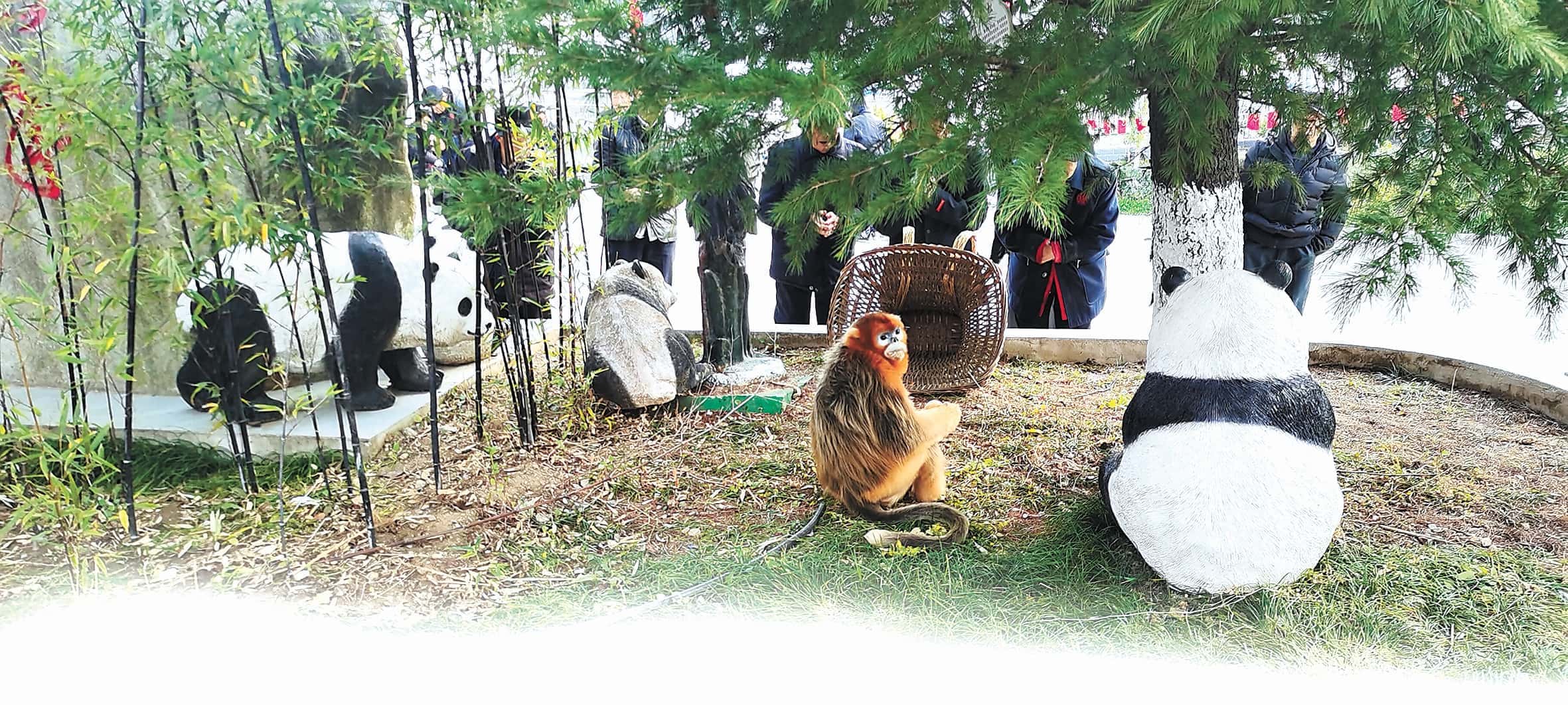 2023年12月4日,一只体格硕大的川金丝猴来到县城以北2公里处的佛坪县中心敬老院。“猴哥”大摇大摆,爬上雪松树,眼睛直瞪着树下的熊猫雕塑,似乎在惊诧发问:“你咋也来了?”