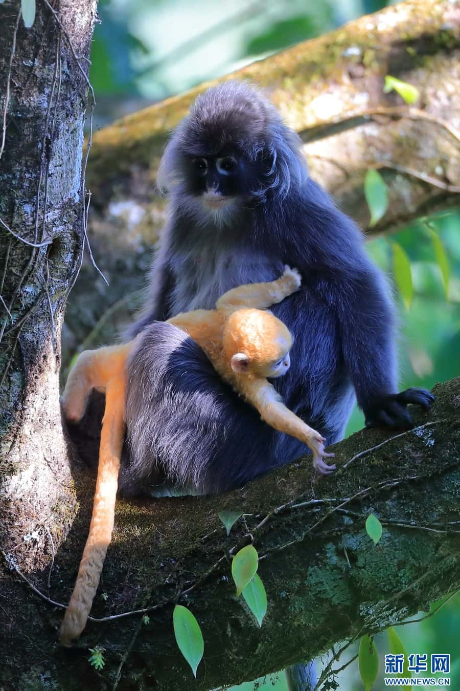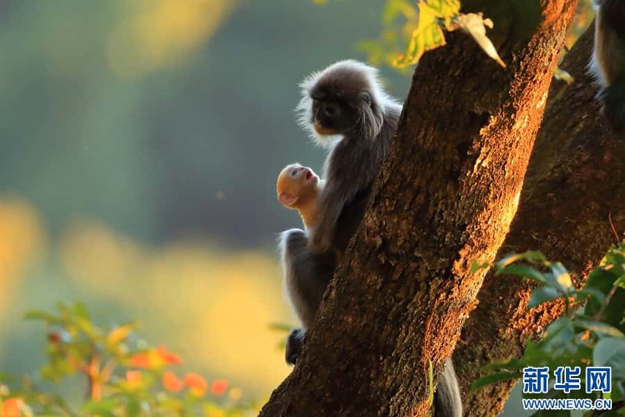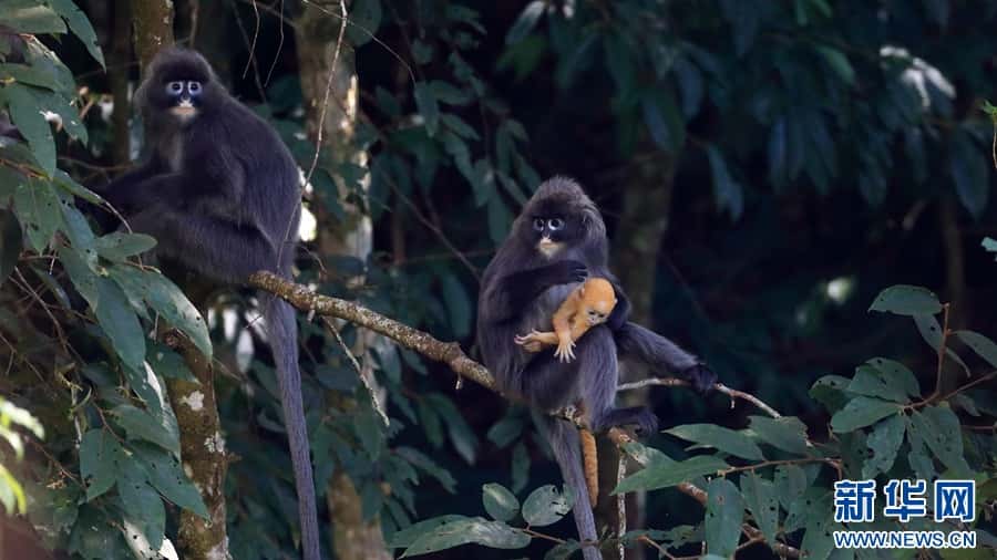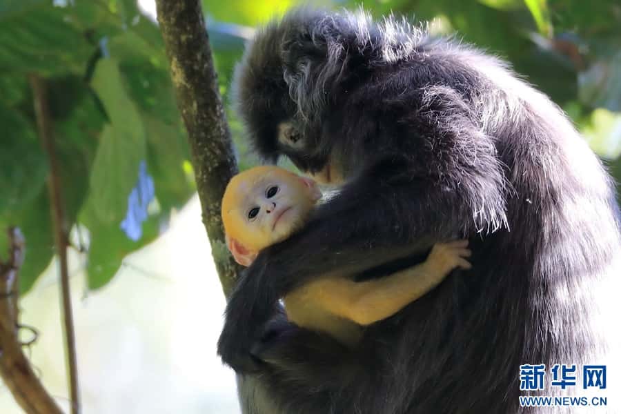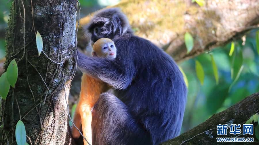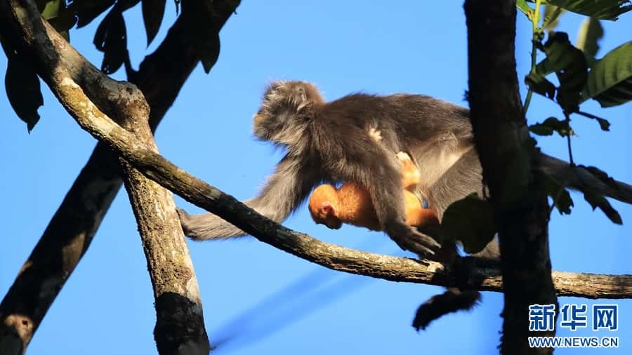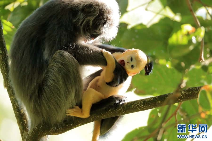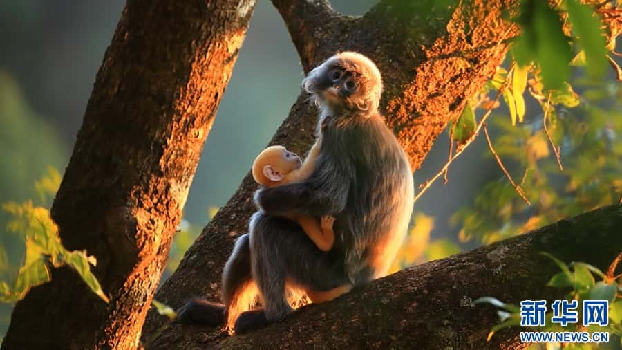 菲氏叶猴是国家一级重点保护野生动物,“猴宝宝”们刚出生时全身金黄,长到3个月左右的时候,逐渐“换装”成银灰色。菲氏叶猴不仅外形软萌可爱,还是猴界“乖宝宝”,几乎没有破坏农作物的“不良记录”。