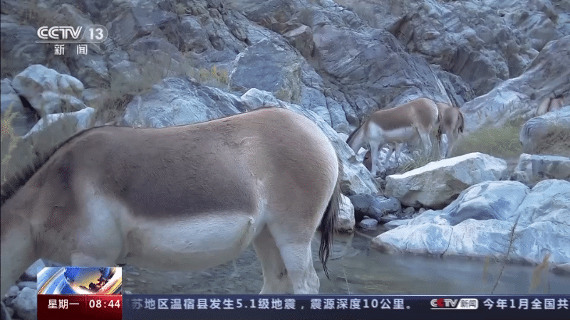 接着入镜的,是一群体形高大的藏野驴。只见它们肌肉健壮,皮毛顺滑,营养良好的外观与库姆塔格沙漠的千里荒芜形成一种奇异的反差之美。
