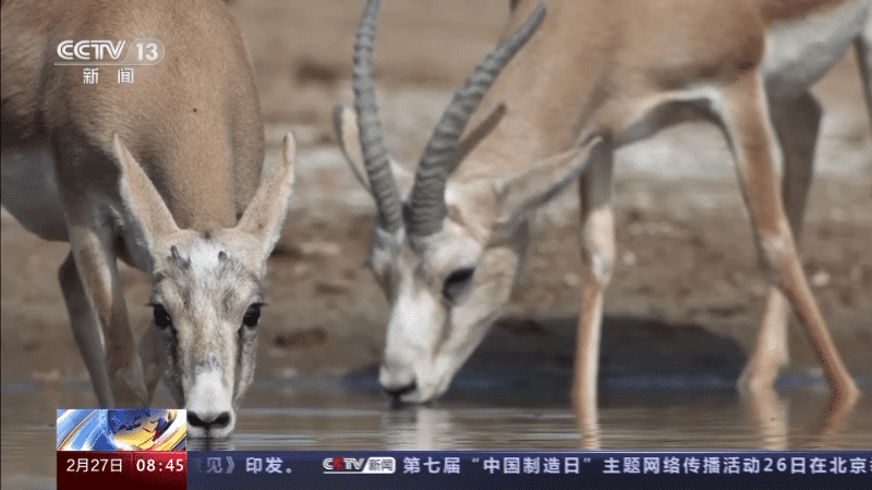 甘肃省安南坝野骆驼国家级自然保护区管护中心副高级工程师 周多良:那时候我们发现野生动物饮水特别困难,我们就想办法从48公里以外的安南坝河,放了塑料的地埋管子引水以后,修了这个饮水池,周围方圆四五十公里的所有野生动物都可以到这儿喝水。