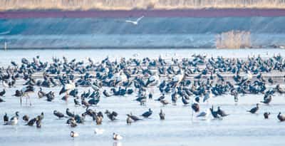 此刻,数以万计的鸟儿正在这片湿地停留。它们中有普通鸬鹚、灰鸻、蛎鹬、白鹭、苍鹭、卷羽鹈鹕等,它们春迁途经此地短暂停留,补充能量;也有国家一级重点保护野生动物东方白鹳等,它们在此越冬,经过了一冬天的停留,在等待北飞的时机。等到3、4月份,还将有大批鸻鹬类鸟儿途经此地,中转后开始漫长的迁徙旅程。