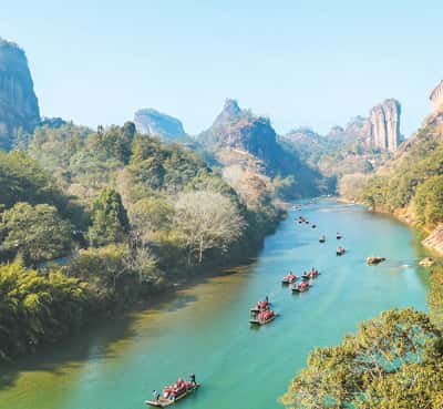 游人乘坐竹筏在福建武夷山国家公园九曲溪漂流。新华社发
