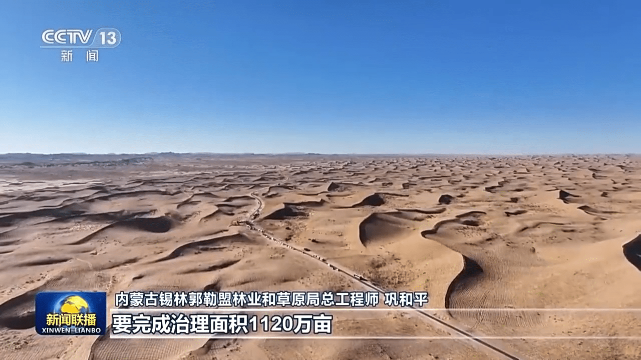 内蒙古锡林郭勒盟林业和草原局总工程师 巩和平:冬天它能被覆盖一些雪,还能保持一定的湿度。等来年达到一定温度时候,它就生长,生根发芽,在沙障中间的空地上,我们进行灌木,这些灌草的一些混播,达到一个综合治沙的效果。我们规划的是在2025年以前,要完成治理面积1120万亩。