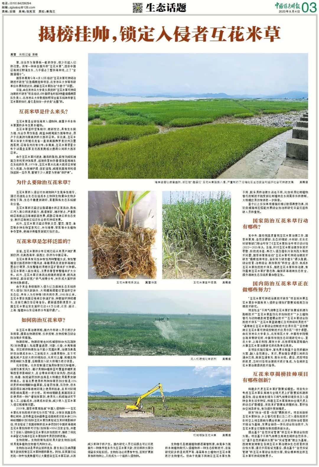 2019年,国家林草局批准“中国入侵物种——互花米草化学防控技术研究与示范”项目,分别在我国亚热带红树林、亚热带盐沼和温带盐沼湿地进行抗米净(25%咪唑烟酸水剂)防除互花米草效果验证及其环境影响评估,项目验证了我国研制的抗米净药剂对中国滨海湿地互花米草防除的可行性(防除率>95%)及安全性,并建立了目标入侵物种互花米草化学防控技术,推进了将抗米净登记为滩涂互花米草防除专用药剂的进程。