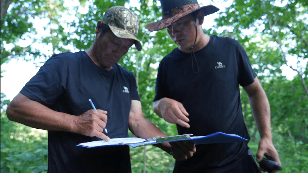 东北虎豹国家公园社区共管巡护队队员进行记录。新华社记者 司晓帅 摄
