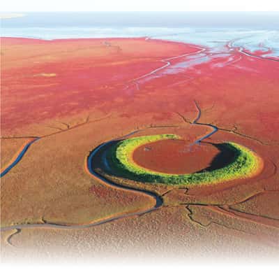 辽河口湿地,红色的盐地碱蓬与绿色植被交织形成美丽的景色。