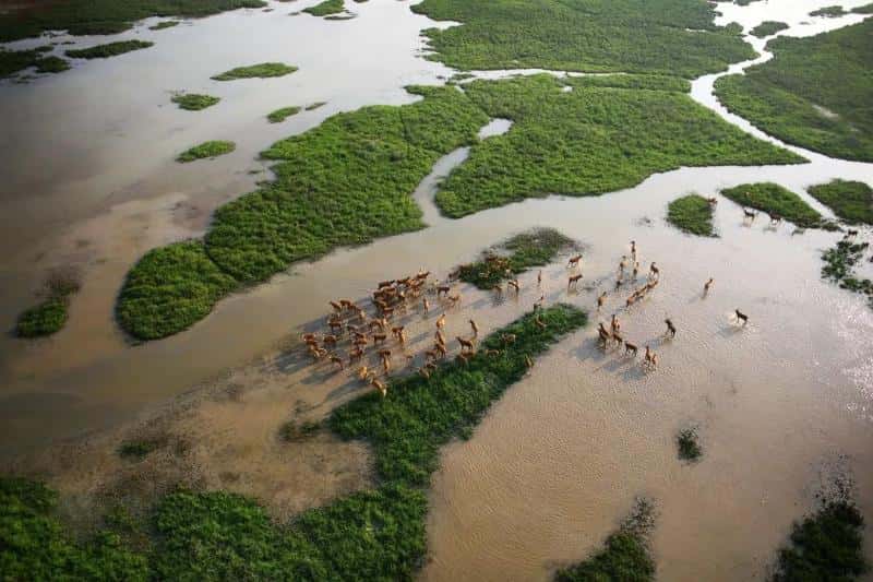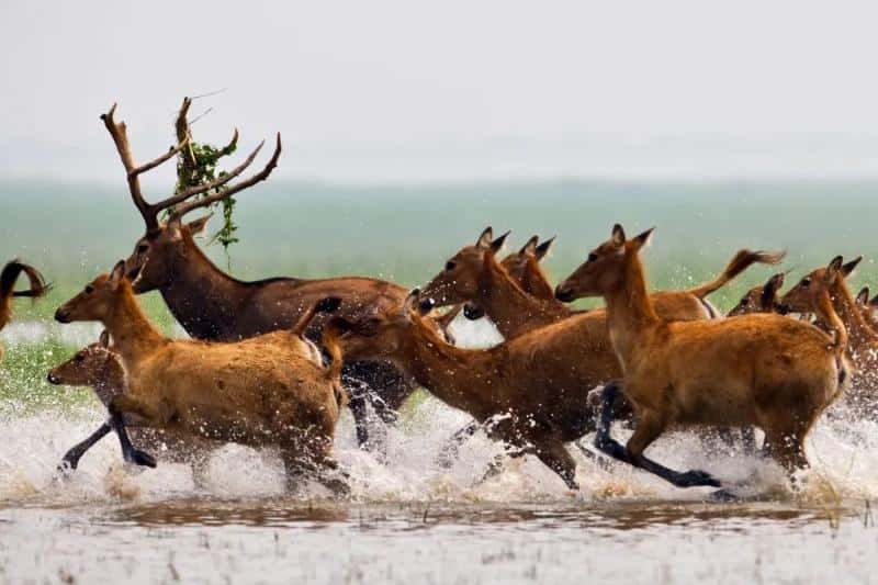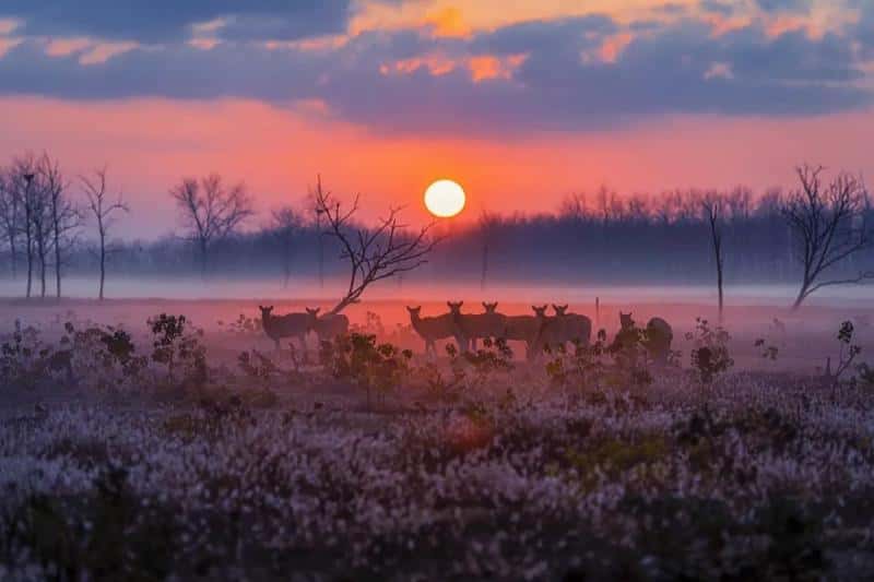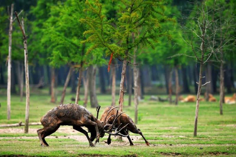 江苏大丰麋鹿国际重要湿地坐落在盐城黄海湿地,占地面积4万亩,1986年建立。承担着保护麋鹿、丹顶鹤及其湿地生态系统,恢复野生麋鹿种群的重要任务。