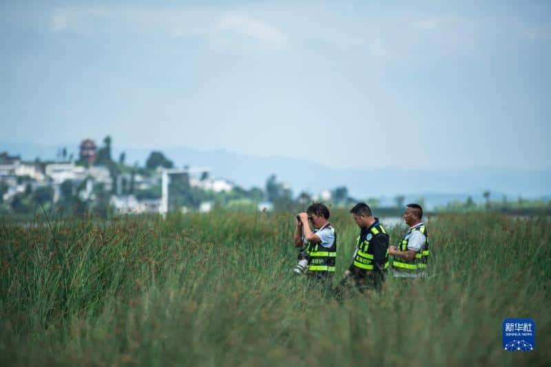 贵州草海国家级自然保护区,草海巡护队副大队长刘广惠(左一)和队员在日常工作巡护中(2021年7月8日摄)。新华社记者 陶亮 摄