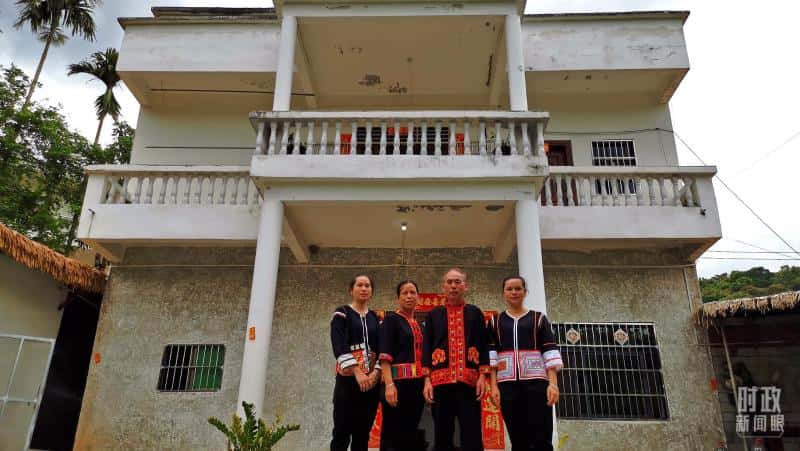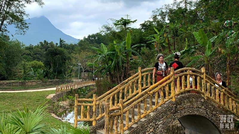 五指山脚下的黎族村寨与当地村民。(总台央视记者段德文拍摄)
