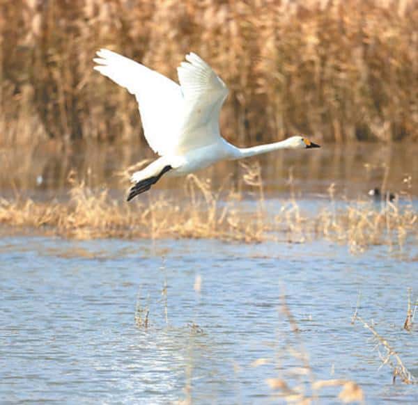 山东东营黄河三角洲湿地,一只天鹅在水上飞翔。周广学摄