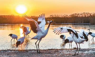 丹顶鹤在辽宁省盘锦市辽河口国家级自然保护区嬉戏。孙小伟摄(人民图片)