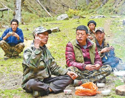 钟泰(左三)和护林员们在野外巡护间隙用餐。于凤琴摄(人民视觉)