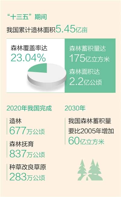 据悉,2000年到2017年全球新增绿色面积中,约1/4来自中国,中国贡献比例居全球首位。2020年我国完成造林677万公顷、森林抚育837万公顷、种草改良草原283万公顷。增加森林面积、提高森林质量、提升生态系统碳汇增量,将为我国碳达峰、碳中和目标、维护全球生态安全做出更大贡献。