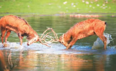 北京南海子麋鹿苑的“鹿王争霸”。 |