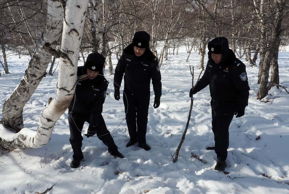 11月27日,克什克腾旗森林公安民警在黄岗梁国家森林公园内,解除盗猎分子下的钢丝套,消除野生动物安全隐患。新华社发(王志国 摄)