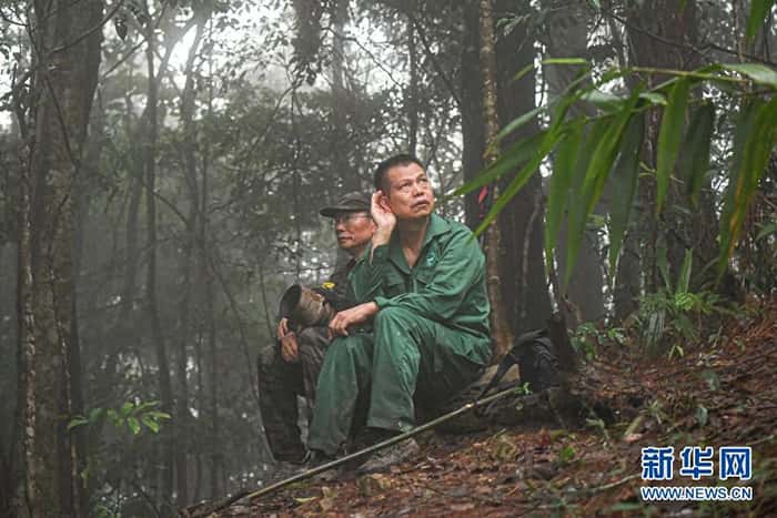 11月16日清晨,调查人员在海南霸王岭热带雨林中监听海南长臂猿鸣叫,希望根据猿声找到海南长臂猿 新华社记者 蒲晓旭摄