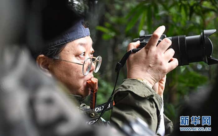 11月12日,由于海南长臂猿突然出现,调查人员叼起正在吃的火腿肠,立即开始拍摄远处的海南长臂猿 新华社记者 蒲晓旭摄