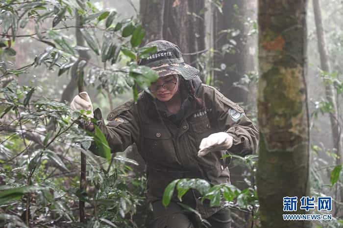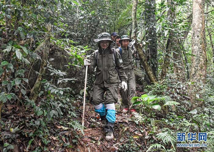11月16日,调查人员在海南霸王岭的热带雨林中寻找海南长臂猿猿食植物样本 新华社记者 蒲晓旭摄