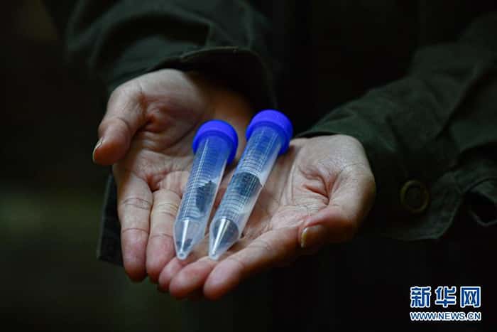 11月13日,调查人员展示在海南霸王岭热带雨林中采集的海南长臂猿粪便样本 新华社记者 蒲晓旭摄