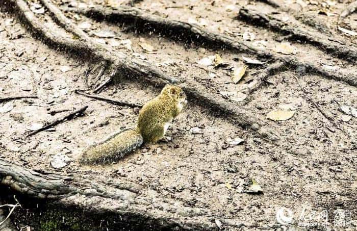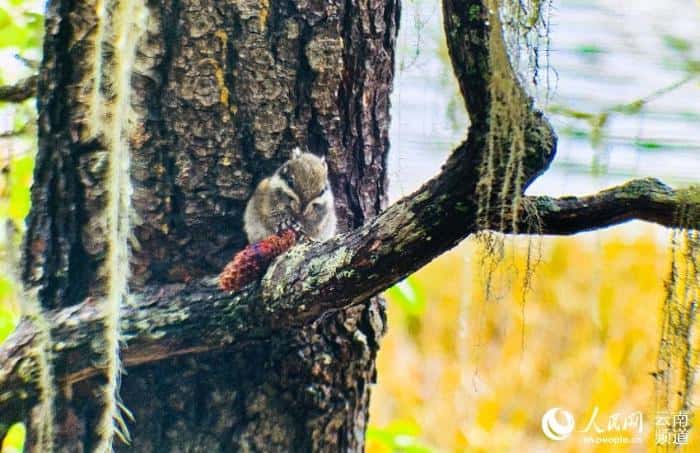沿着湖边的木质栈道漫步,游客与原始森林零距离接触,感受虫鸣鸟叫的欢快与舒畅。林间不时跑出可爱的小松鼠,它们或捡拾着地上的松果,或向游客讨要吃的,呆萌的样子非常可爱。(曾智慧)