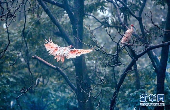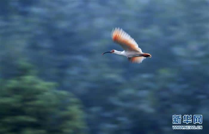 在洋县,随处可见成群结队的朱鹮在汉江及汉江支流的河滩和湿地觅食、栖息。洋县陈家村附近归巢的朱鹮(8月1日摄) 新华社记者 兰红光摄