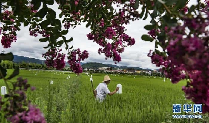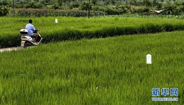 近年来,洋县农技推广中心在朱鹮保护区的稻田中安装了3000多套(台)昆虫诱捕器、诱虫杀虫灯,全面采用物理生态防虫技术,有效保护朱鹮生存环境。洋县纸坊街道草坝村村民在查看水稻田间的昆虫诱捕器(7月15日摄) 新华社记者 陶明摄