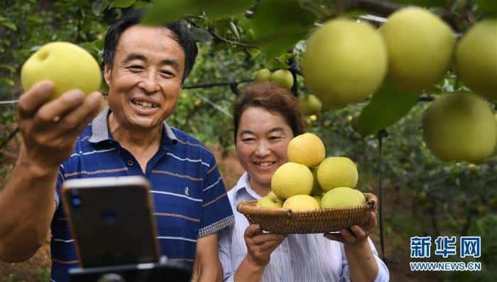 洋县纸坊街道草坝村刘小刚夫妇在黄金梨园里直播(8月3日摄) 新华社记者 陶明摄