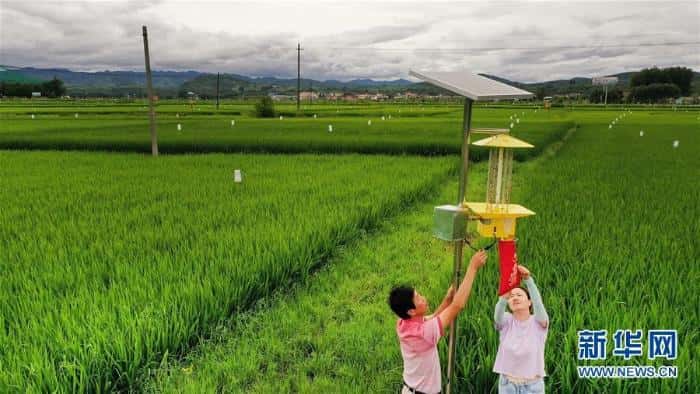 洋县农技推广中心技术员在纸坊街道周家坎村的水稻田间查看杀虫灯诱捕情况(7月15日摄) 新华社记者 陶明摄