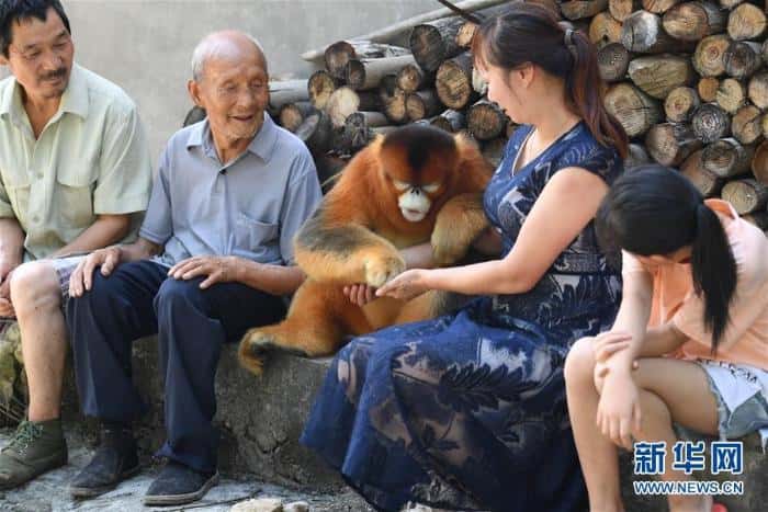 下山“串门”的金丝猴与洋县茅坪镇茅坪村村民在一起(8月2日摄) 新华社记者 陶明摄