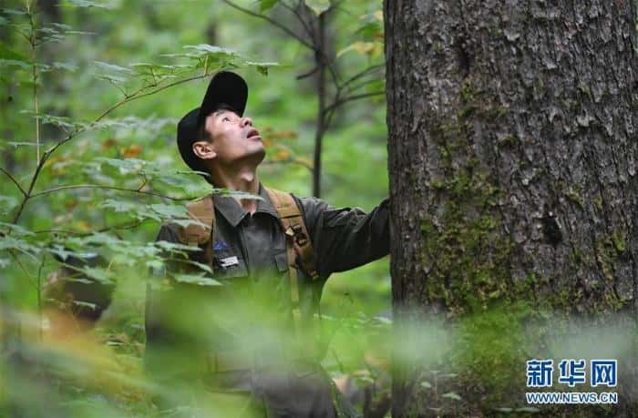 9月2日,巡护员在吉林长白山国家级自然保护区的森林里查看树木上的生长情况 新华社记者 颜麟蕴摄