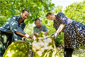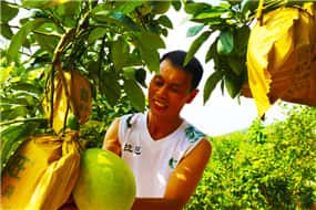 贵州省荔波县拉岜村党支部书记覃树友正在给蜜柚套袋