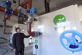 支持贫困地区大气、水、土壤污染防治,解决突出的生态环境问题,增进贫困群众获得感幸福感。图为工作人员在河北省围场县桃山村易地搬迁居民安置点,对使用环保地源热泵采暖技术的供暖设施运转情况进行检查。