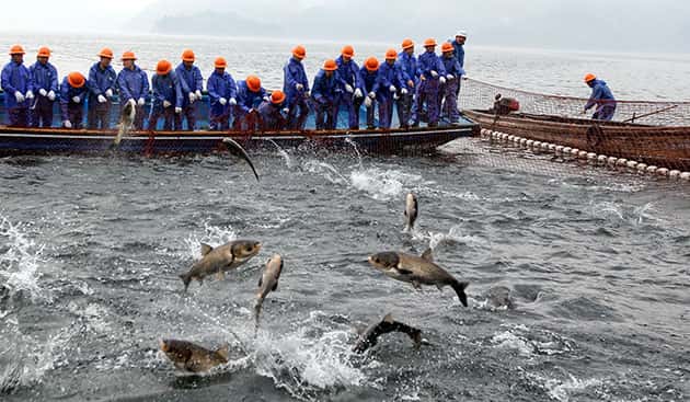 开展流域上下游横向生态补偿试点。目前,长江流域9省市与毗邻省份签订上下游补偿协议,10省市建立了省(市)内流域横向生态补偿机制,一批长期存在的环境问题得到解决,跨界断面水质明显改善,上游地区一大批贫困县受益。图为被称为“中华一绝”的千岛湖巨网捕鱼现场。