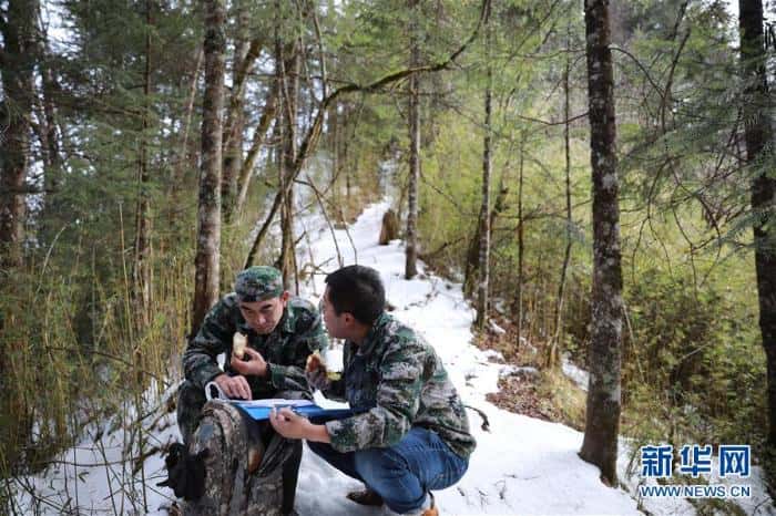 12月13日,巡护员张雄(左)和许可在巡护途中吃午餐 新华社发(杜哲宇摄)