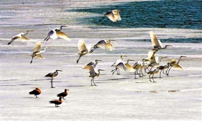 成群的白鹭和赤嘴潜鸭在花马湖翩翩起舞(资料图片)