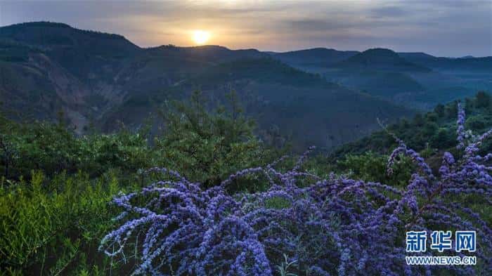 在陕西省吴起县马湾村,醉鱼草花绽放,如紫色的云彩覆盖在绵延起伏的山峁上(6月7日摄) 新华社记者 陶明摄