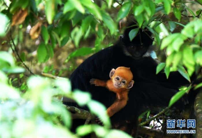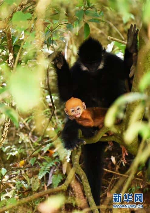这是6月4日在麻阳河国家级自然保护区大河坝观测点拍摄的黑叶猴及幼崽 新华社记者 杨文斌摄
