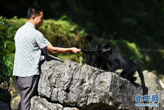 6月4日,在麻阳河国家级自然保护区大河坝观测点,驻站护林员在给黑叶猴喂食 新华社记者 杨文斌摄