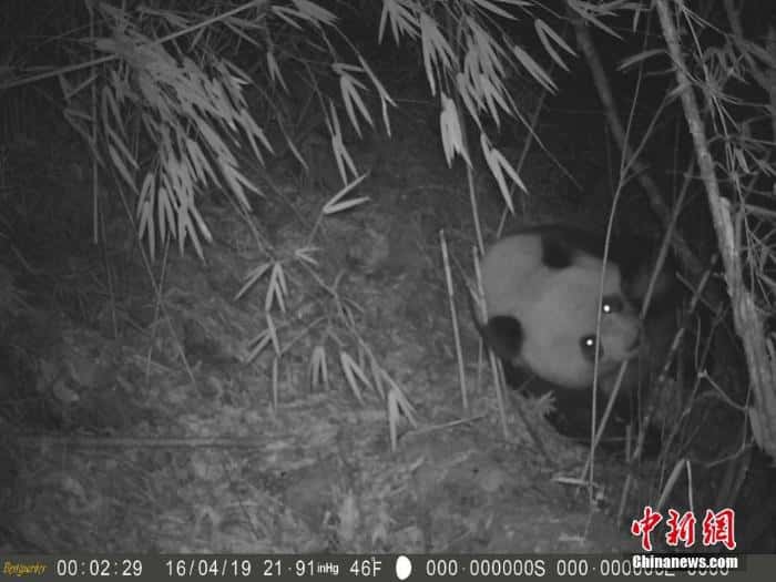 拍摄地点海拔在2680米左右,该地区竹林茂密,水源丰富,是大熊猫天然的栖息地。拍摄时间为2019年4月16日零时左右,画面中的大熊猫正躺在地上惬意地吃着竹子。图为红外相机拍摄的野生大熊猫。勿角保护区 供图