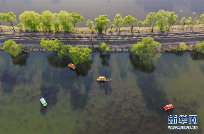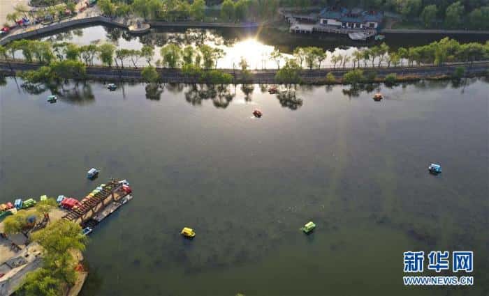 在吉林市北山公园,游人在湖面划船游玩(5月11日无人机拍摄) 新华社记者 许畅摄