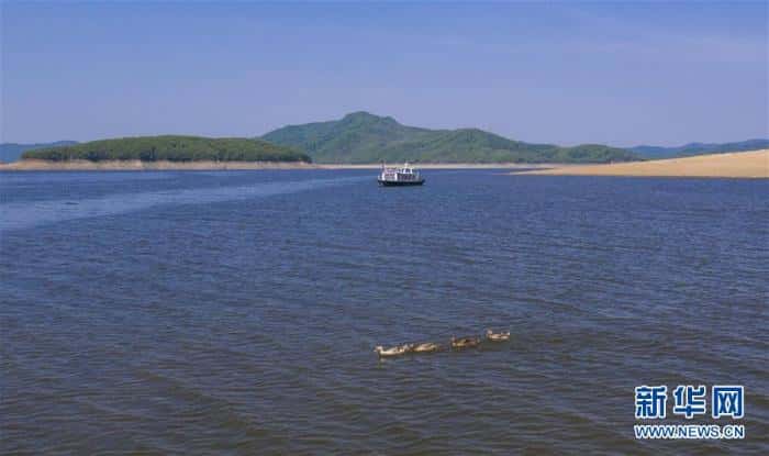 在吉林市松花湖,几只野生水禽在水面上游弋(5月12日无人机拍摄) 新华社记者 许畅摄