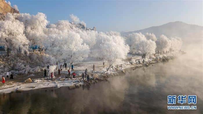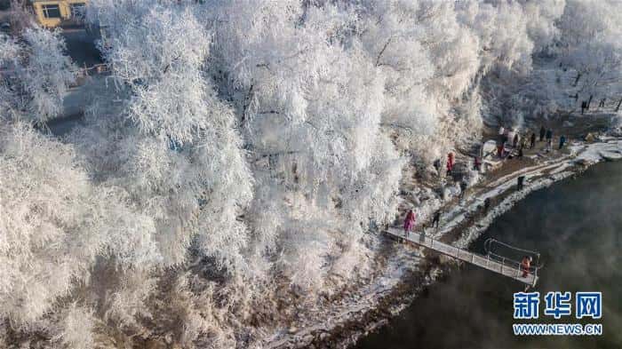 游人在吉林市阿什哈达雾凇观赏带观赏雾凇景观(2018年12月12日无人机拍摄) 新华社记者 张楠摄