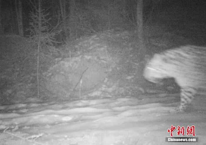 东北虎豹国家公园管理局天桥岭分局4月16日对外发布消息称,近日天桥岭林区首次拍摄到了野生东北豹的实体影像。据介绍,本月10日,天桥岭分局工作人员在西大河林场采集远红外相机信息时,发现架设在西大河林场26林班的两台远红外线相机,分别拍摄到一张野生东北豹头像照片,一段野生东北豹视频,视频时长2秒,拍摄时间为2月3日19时15分7秒。图为吉林天桥岭首次拍摄到野生东北豹实体影像。