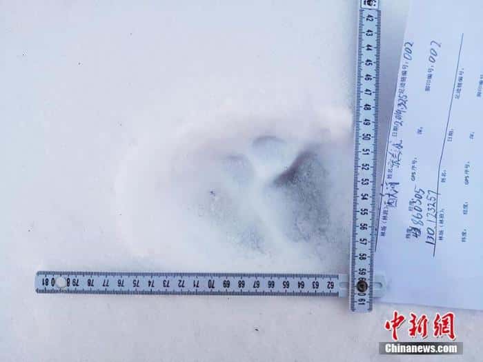 据了解,今年3月25日,该林场1林班也曾发现了野生东北豹的足迹,距本次拍摄地仅6.78公里。图为天桥岭分局发现的野生东北豹的足迹 。(文/许传翔 延长才 刘宸行 天桥岭分局供图)