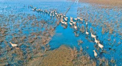 每年3到5月是麋鹿繁殖期,江苏大丰麋鹿国家级自然保护区的麋鹿种群在这一时期会集中在湿地滩涂活动,成群的麋鹿聚集在滩涂湿地觅食、嬉戏,构成一幅生机盎然的生态图画。