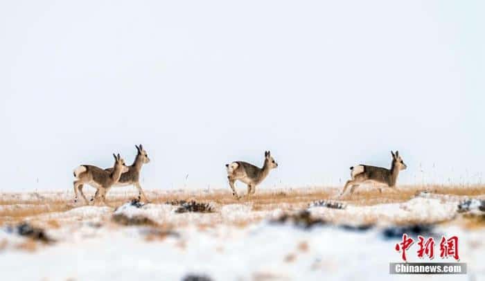 初春时节,地处甘肃河西走廊西端、祁连山下的甘肃省酒泉市肃北蒙古族自治县盐池湾国家级自然保护区,天气渐暖,寒冷渐退,藏野驴、藏原羚、白唇鹿、岩羊等野生动物成群结队,在保护区内频频出现 图为奔跑中的藏野驴 孟根朝力摄
