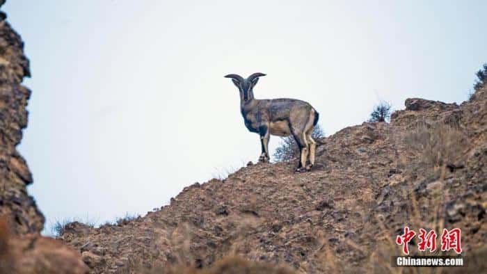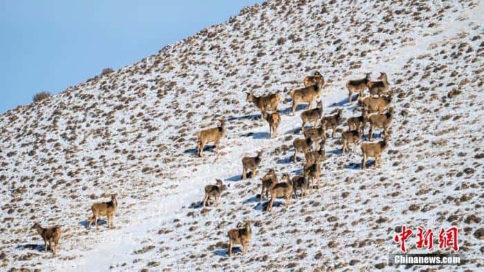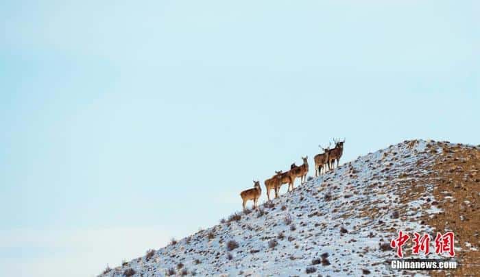 初春时节,地处甘肃河西走廊西端、祁连山下的甘肃省酒泉市肃北蒙古族自治县盐池湾国家级自然保护区,天气渐暖,寒冷渐退,藏野驴、藏原羚、白唇鹿等野生动物成群结队,在保护区内频频出现。图为一群白唇鹿在山巅觅食 孟根朝力摄