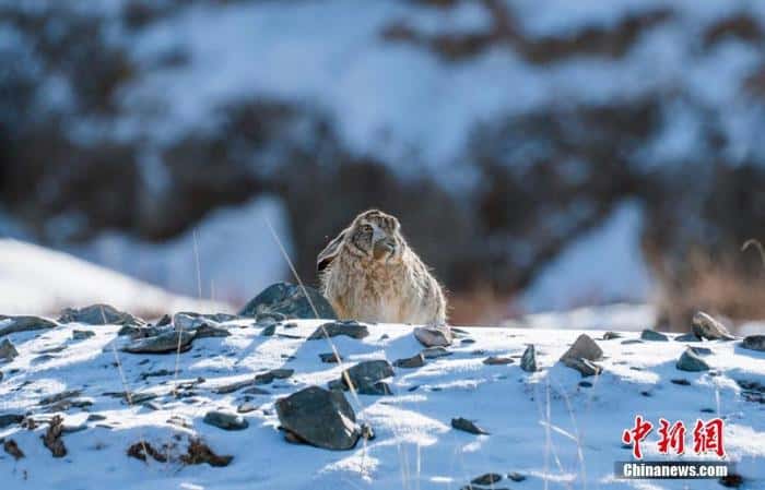 初春时节,地处甘肃河西走廊西端、祁连山下的甘肃省酒泉市肃北蒙古族自治县盐池湾国家级自然保护区,天气渐暖,寒冷渐退,藏野驴、藏原羚、白唇鹿等野生动物成群结队,在保护区内频频出现。图为晒太阳的野兔 孟根朝力摄